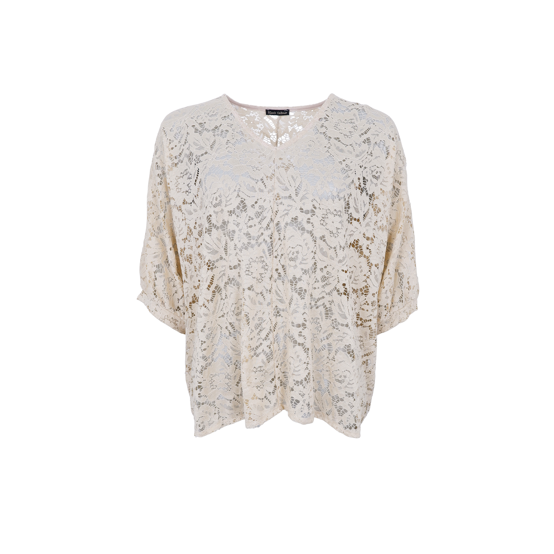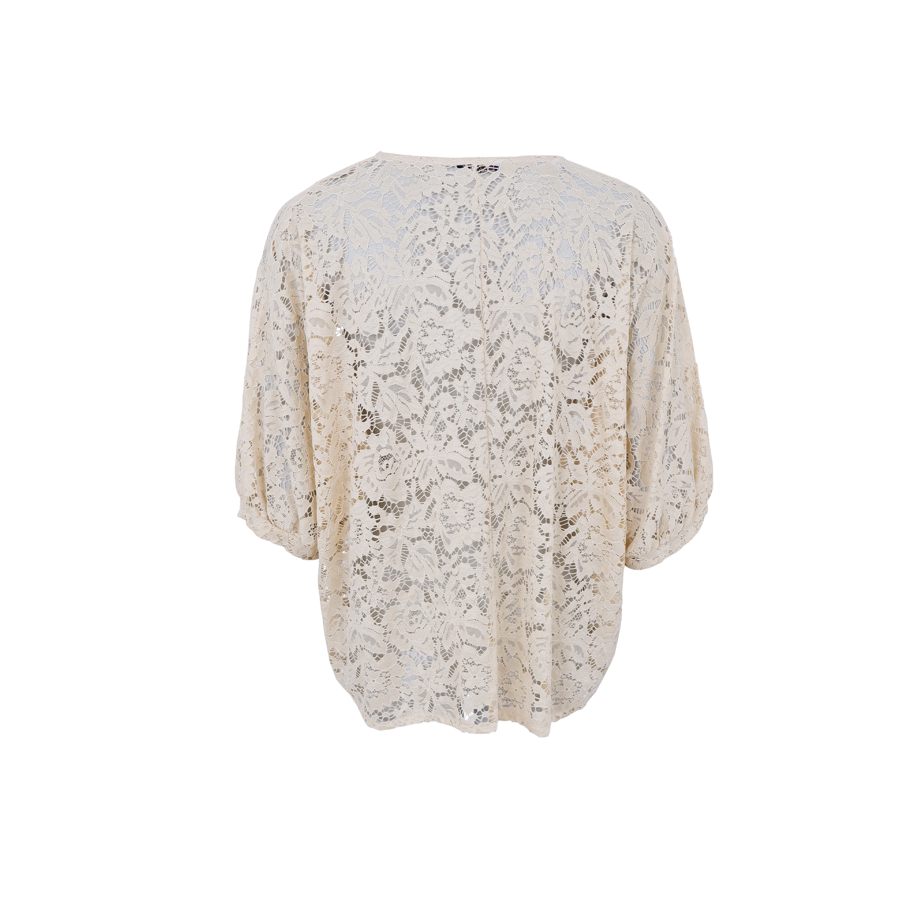 Kvenleg blúndublússa með léttum og glæsilegum svip. Blússan er með lausu og léttu snið, með stuttum ermum og flatterandi V-hálsmáli að framan. Falleg blúndan skapar fágað og rómantískt útlit. Hægt er að nota blússuna eina sér með gallabuxum eða buxum fyrir hversdagsútlit, eða sameina hana með samsvarandi pilsi fyrir fullkomið og stílhreint sett.