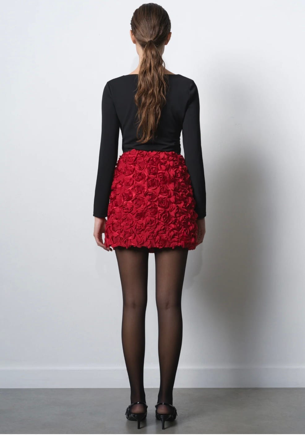 Our Verity 3D Floral Textured Mini Skirt is in full bloom. This red mini skirt is covered in bold 3D rosettes, bringing textured drama and a seriously romantic mood.