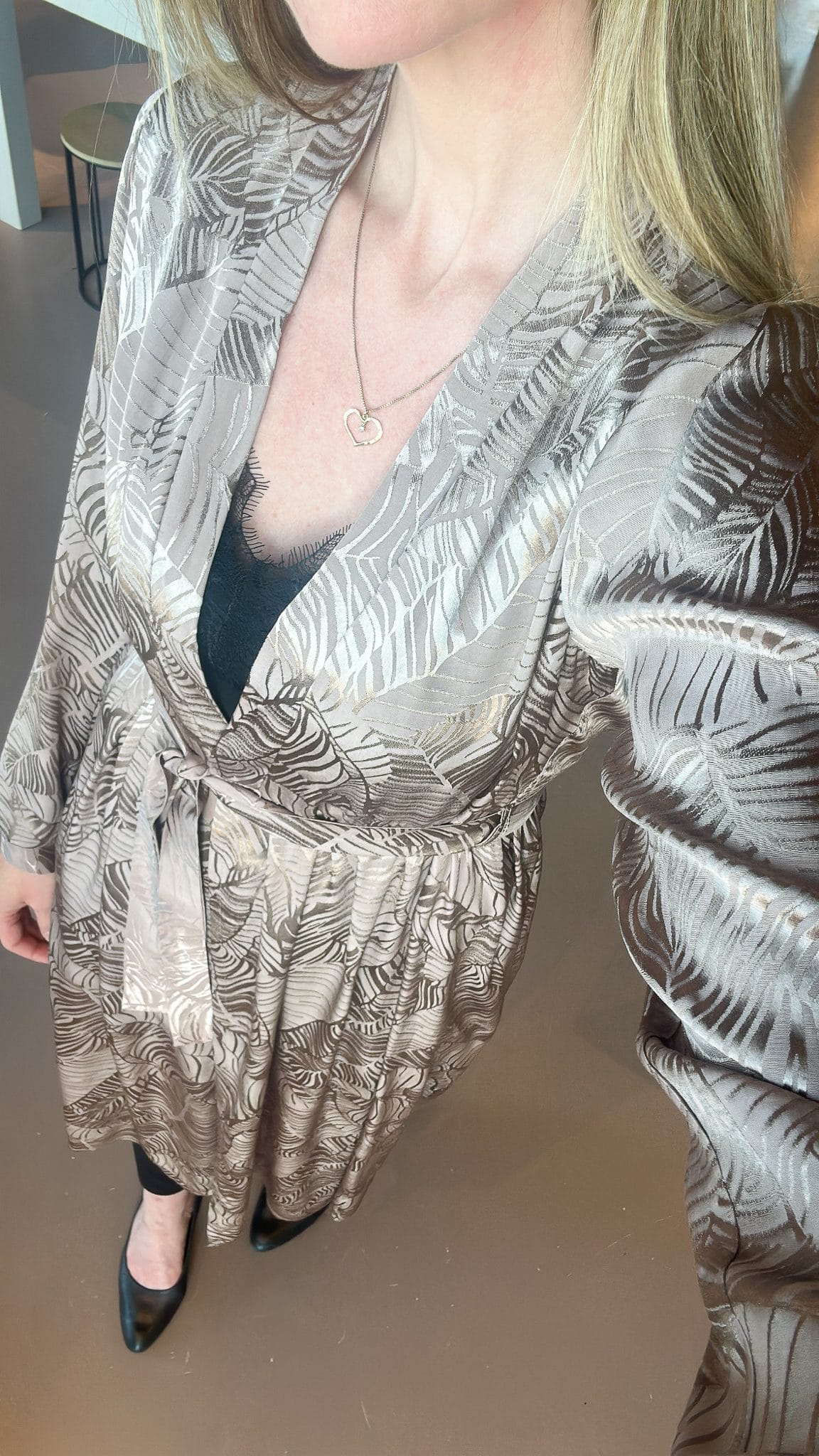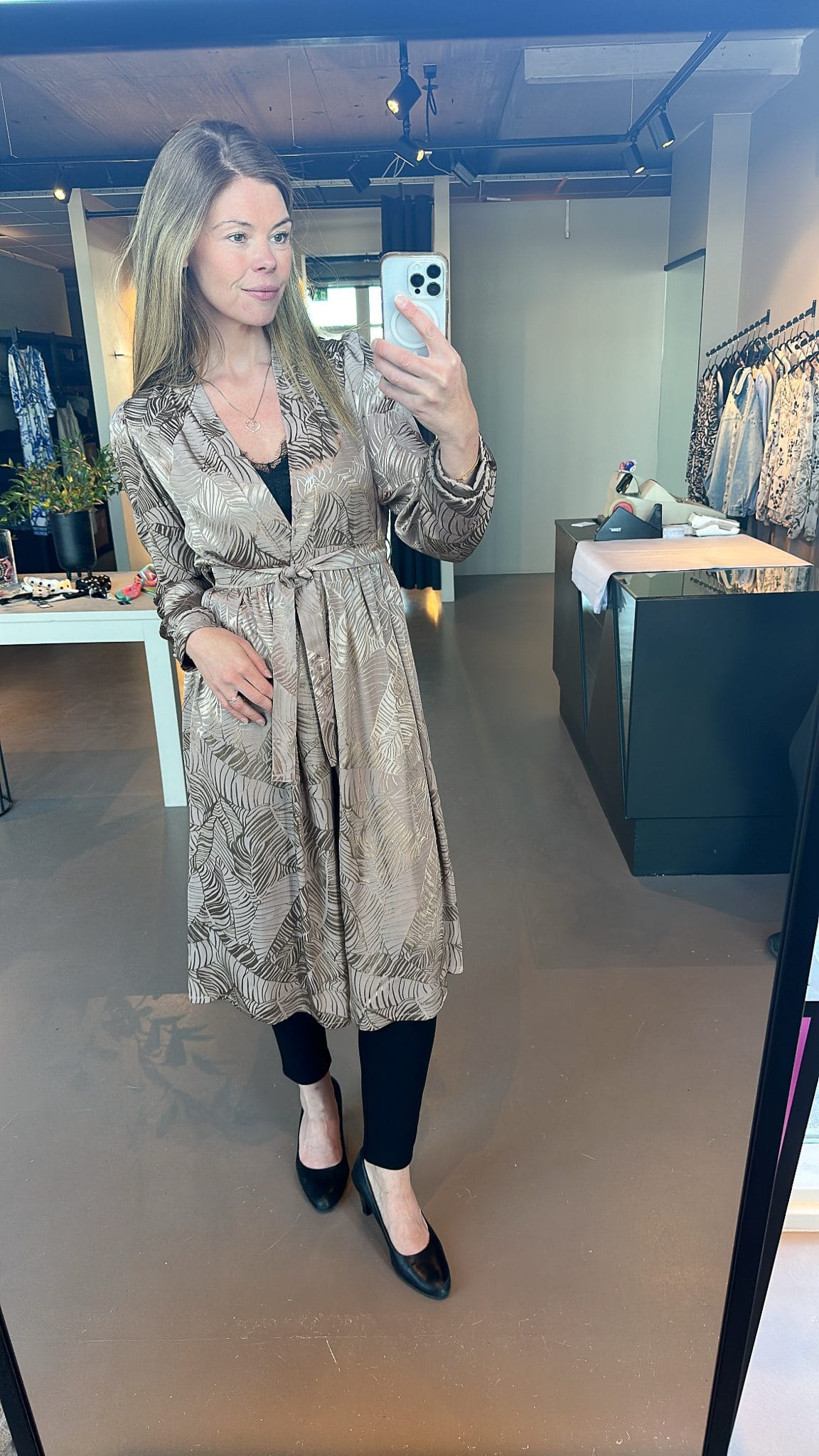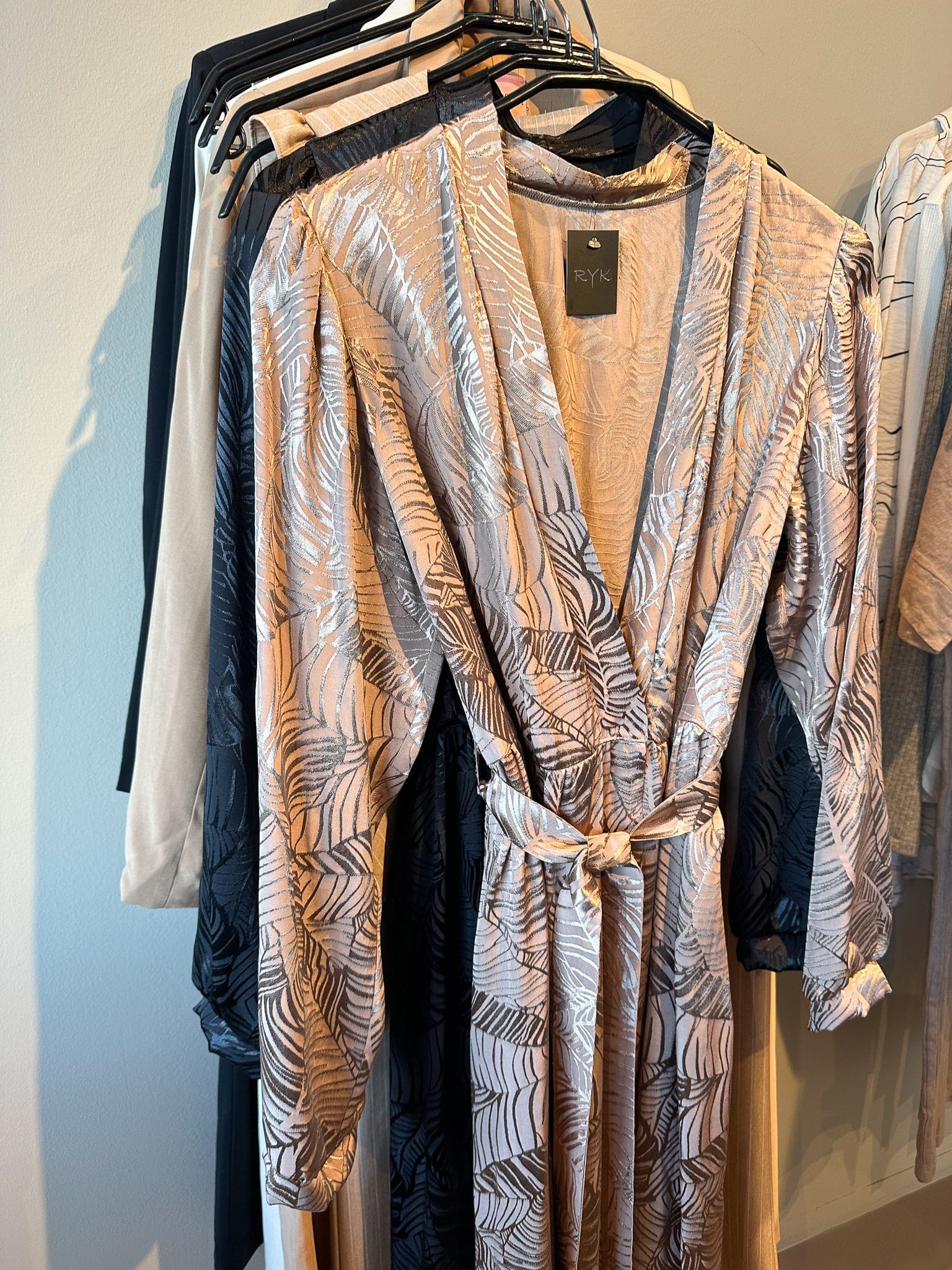Ilmur kjóll í nýju efni, fallegt munstur með bæði mattri og glans áferð. Þennan er hægt að nota sem kjól, hann er hnepptur að framan og með belti en það er líka hægt að sleppa beltinu. Einnig er hægt að hafa hann opinn og nota sem kimono utan yfir kjól eða við buxur.