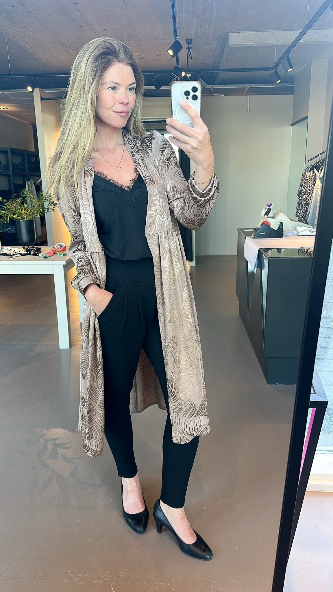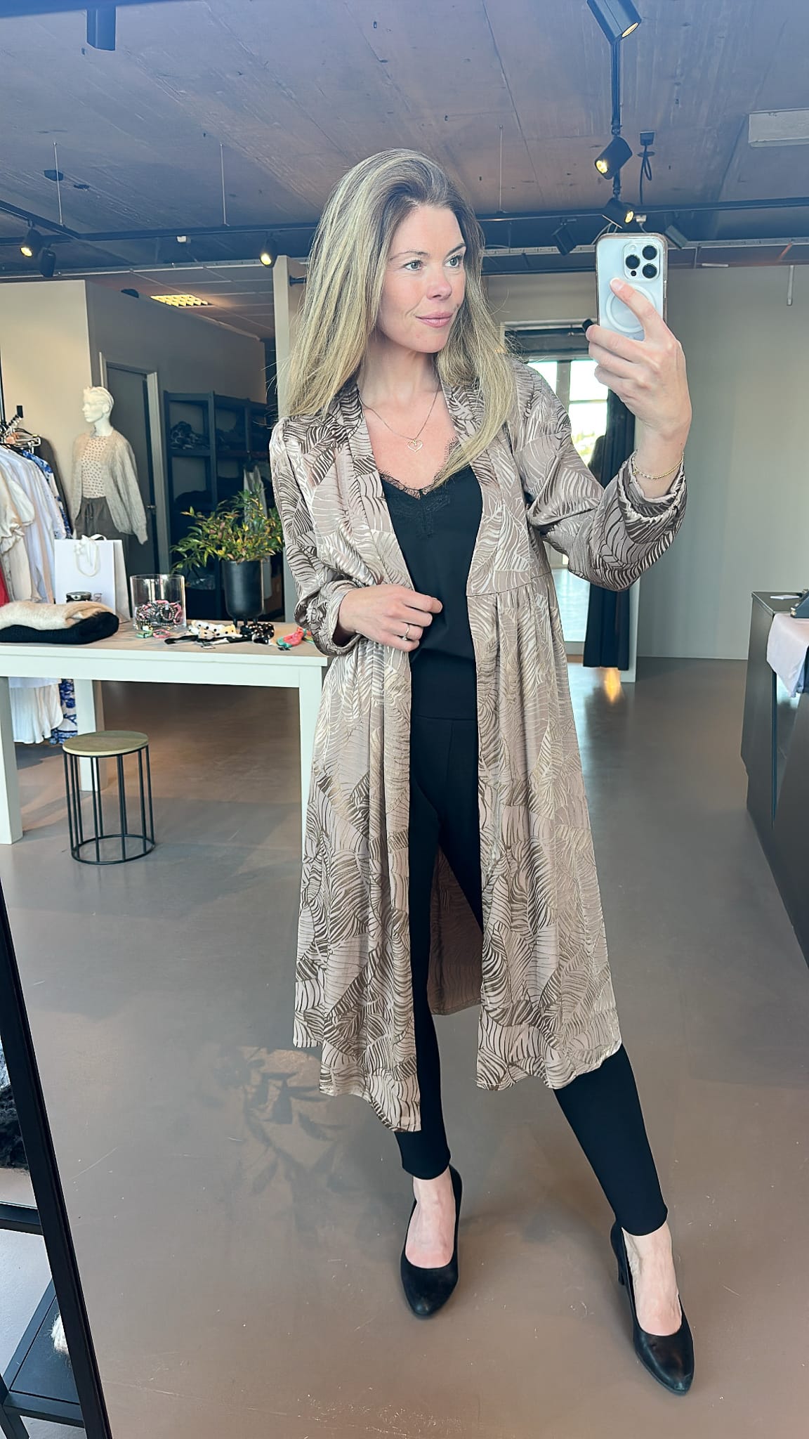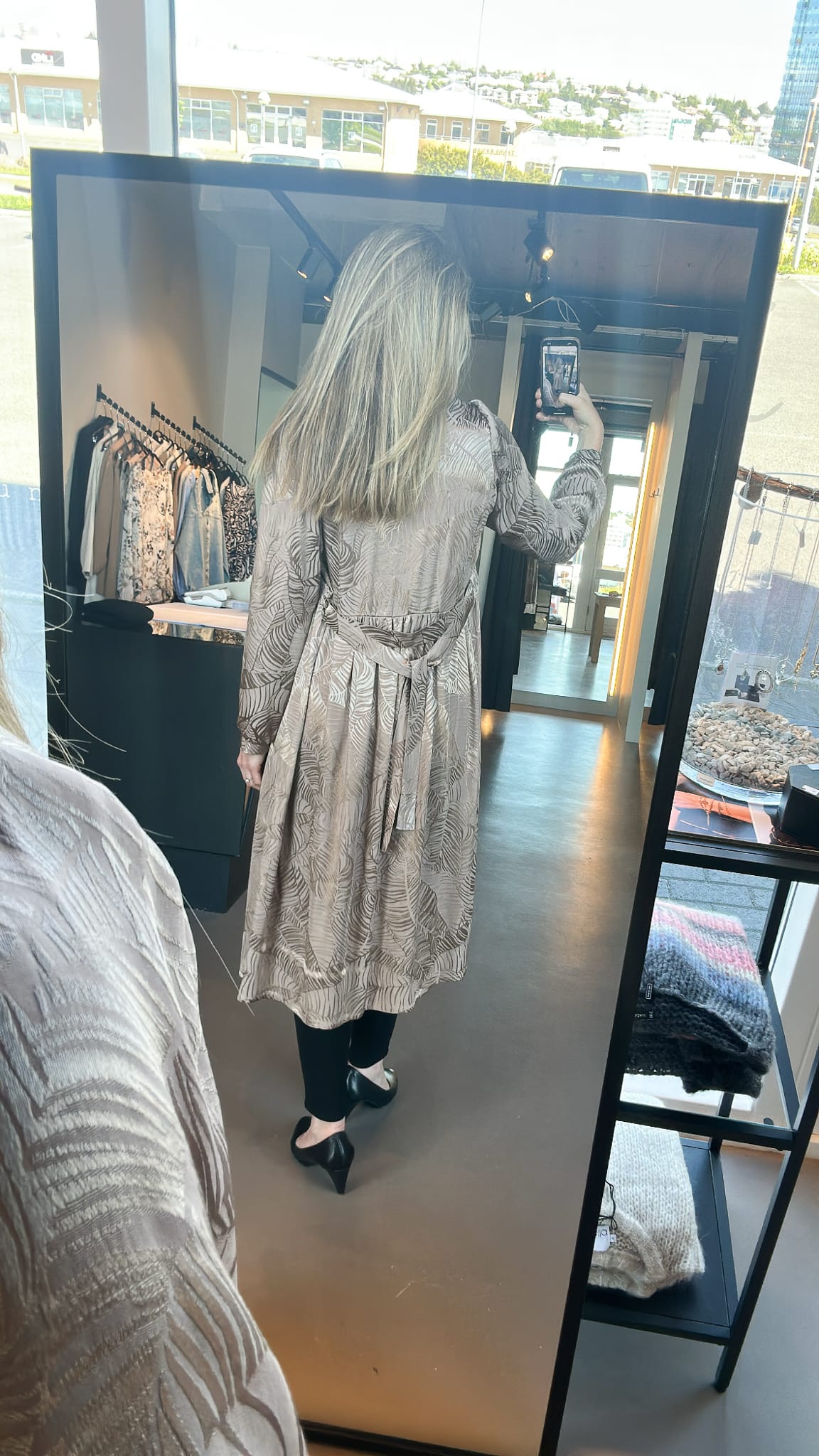 Ilmur kjóll í nýju efni, fallegt munstur með bæði mattri og glans áferð. Þennan er hægt að nota sem kjól, hann er hnepptur að framan og með belti en það er líka hægt að sleppa beltinu. Einnig er hægt að hafa hann opinn og nota sem kimono utan yfir kjól eða við buxur.